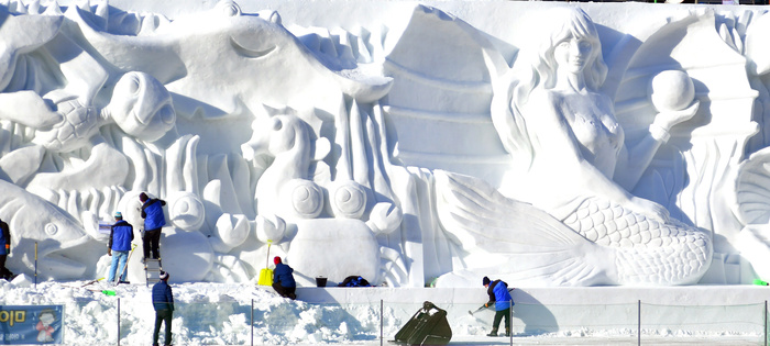 얼음 속에서 직접 산천어를 맨손으로 잡아보는 특별한 체험! 이 프로그램은 어린이와 외국인 관광객들에게 특히 인기 있으며, 참여 후 잡은 물고기는 축제장에서 요리해 맛볼 수 있습니다. - 눈과 얼음 조각 전시
